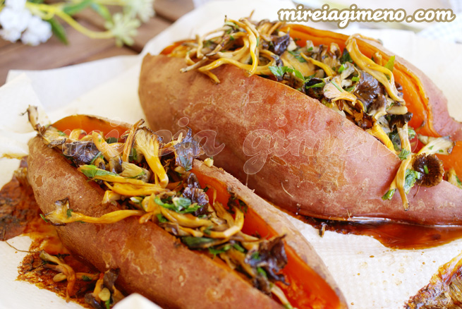 - Servir los boniatos con las setas en la mitad de ellos, donde hemos hecho el corte en el primer paso.